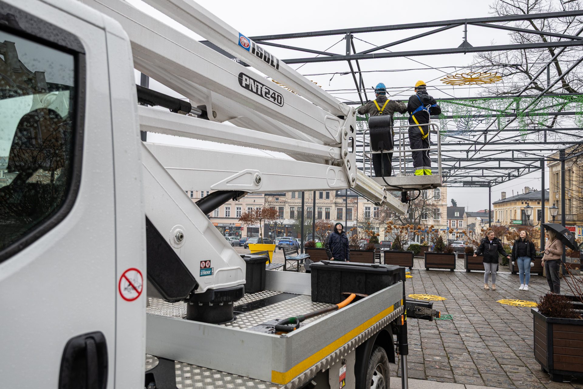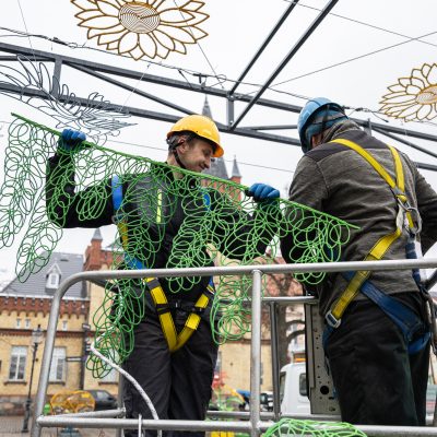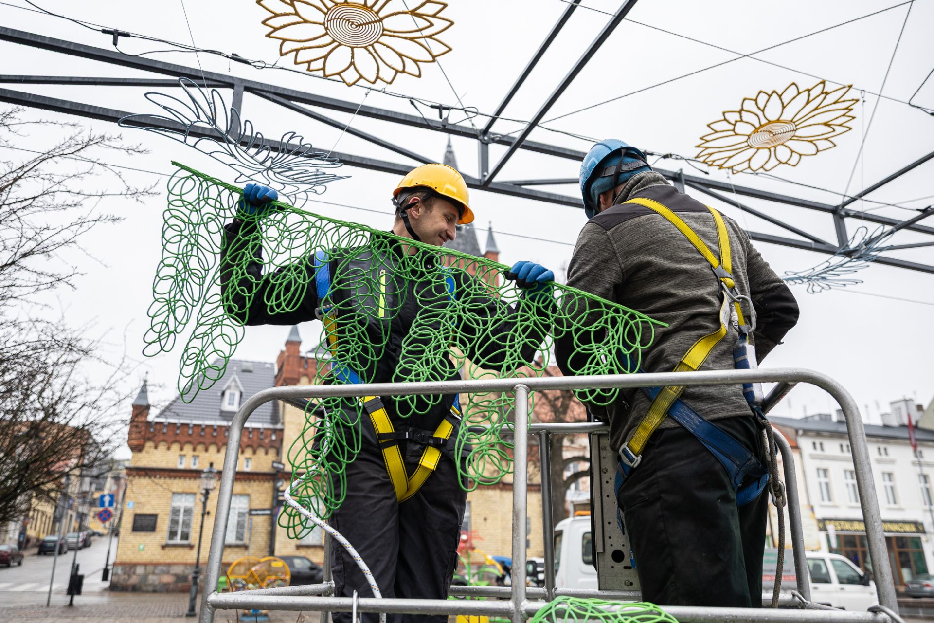 Od rana na Dużym Rynku w Świeciu trwają prace związane z montażem wiosennych dekoracji. Ozdoby zawieszane są na stalowych linkach rozpiętych na metalowym stelażu nad płytą rynku.