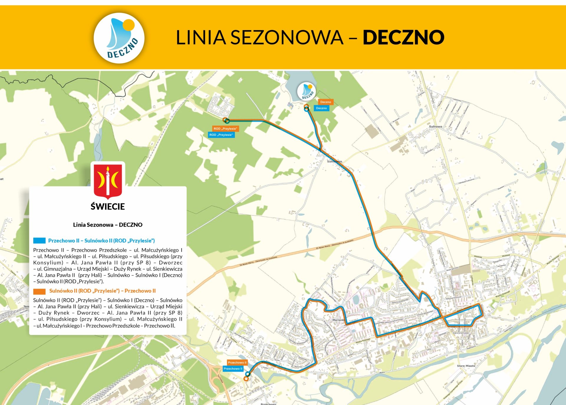 Uruchomienie linii sezonowych ZAMEK i DECZNO ma charakter dowozowy do Zamku Krzyżackiego, Rodzinnych Ogrodów Działkowych za rzeką Wdą oraz Ośrodka Wypoczynkowego nad jeziorem Deczno i Rodzinnych Ogrodów Działkowych „Przylesie”w Sulnówku, poprawiając tym samym komfort mieszkańców.