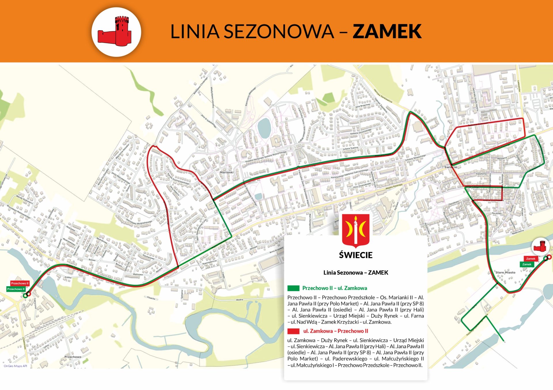 Informujemy, że od 1 maja 2026 r. do 30 września 2026 r. zostaną uruchomione linie sezonowe przebiegające na trasie Zamek Krzyżacki oraz Deczno.